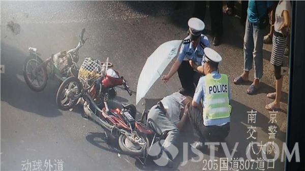 今天(8月5号)上午7点40分左右,南京205国道807道口发生了两辆电瓶车相撞的事故,南京交警八大队小行中队副中队长刘凯和民警乔忠武立刻赶到了现场,其中一名车主是一位年纪较大的老人,他头部受伤,血流不止。见此情况,乔警官立即拨打120急救电话,而刘凯一边查看老人伤情,一边安慰老人,同时将现场情况向大队指挥室汇报。当时室外的温度已经达到了35度左右,阳光直射,酷暑难耐,为了不让受伤老人暴晒在太阳下,增加伤者的痛苦,刘凯中队长立即向周边店铺借来一把伞,又和乔忠武两人用身体和伞充当遮阳棚,帮助老人遮挡阳光,不一会两人就大汗淋漓,身上的制服全渗透了,但他们一直坚持着,直到救护车到达。