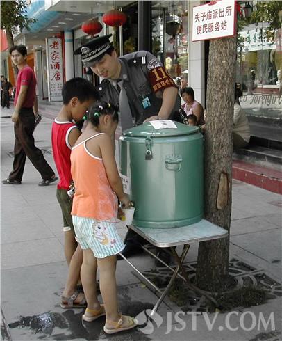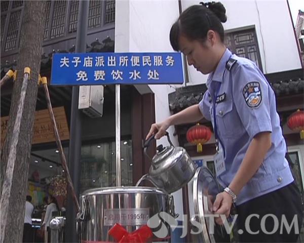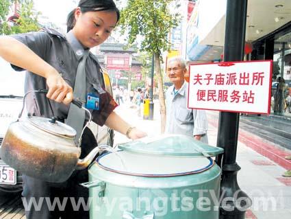 1995年,那时购买矿泉水等饮料的人还不多,夫子庙派出所发现,经常有市民或者游客过来要点开水解渴。他们索性就在派出所门口放了一个便民茶水桶,免费供大家饮用。