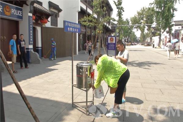 老刘是负责夫子庙牌坊一带的环卫工,每天从早到晚在这附近干活。渴了、累了,他都会到这里,接上一杯热水,坐下歇歇。已经有九年多了。在老刘的印象里,这只茶水桶,就是'方便'的代名词。而对于来来往往的游客来说,能喝上一口免费的热水,也感觉心里头暖暖的
