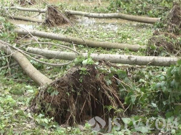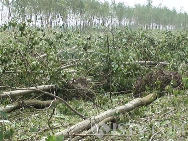 记者在现场时看到,射阳县林苗圃管委会的姜书记正在现场清查倒伏树木。在河堤内侧的树木右东向西整体倒伏,大树连根拔起。据姜书记介绍,倒伏的全部是白杨树,树龄均有十年,直径大约在20厘米左右,他们四个管理区倒伏面积大约200亩左右,倒伏树木一万多株,经济损失大约两百万元左右。