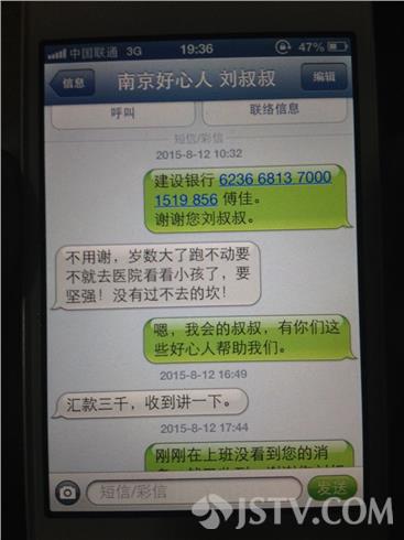 晚上7点,在南京打工的傅佳来到了中大医院,据傅佳介绍,媒体报道后,南京市民对他们全家的遭遇十分关心,从昨天到今天下午,他已经收到了来自南京爱心人士的捐款共计5150元,有的是亲自来到医院捐献的,而更多的,则是汇到他帐号上的,其中,一位捐献了3000元的爱心人士刘叔叔在信息里说道:“不用谢,岁数大,人跑不动,要不就去医院看看小孩了。要坚强,没有过不去的坎。”