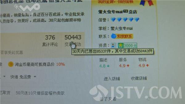 今天(8月20日)荔枝新闻记者向南京的环保组织了解了相关情况。七夕节前夕,来自江苏青环志愿者服务中心的环保志愿者们,在浏览购物网站时发现,网上叫卖萤火虫的商家比去年多了许多,以某购物网站为例,全网萤火虫的销售量,就是去年的10倍。其中,以这家名叫萤火虫淘宝专卖总店销售中心的店铺为最大销售量。