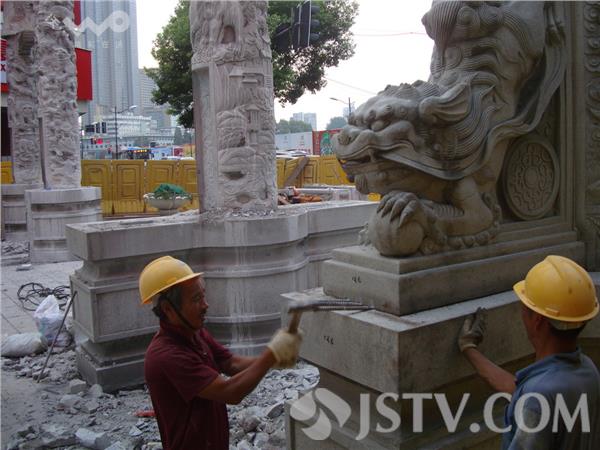 狮子桥牌坊在南京湖南路上已有15年了,因湖南路建地下商业街项目暂别湖南路。8月27日傍晚7点左右,荔枝新闻网友在狮子桥看到,附近的北侧牌坊已开始用吊机拆除,拆下的构件将保存起来。施工人员称,眀年这块牌坊将在原址复建。