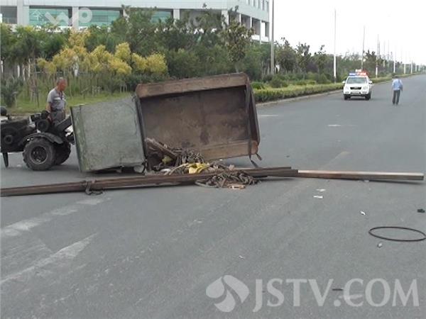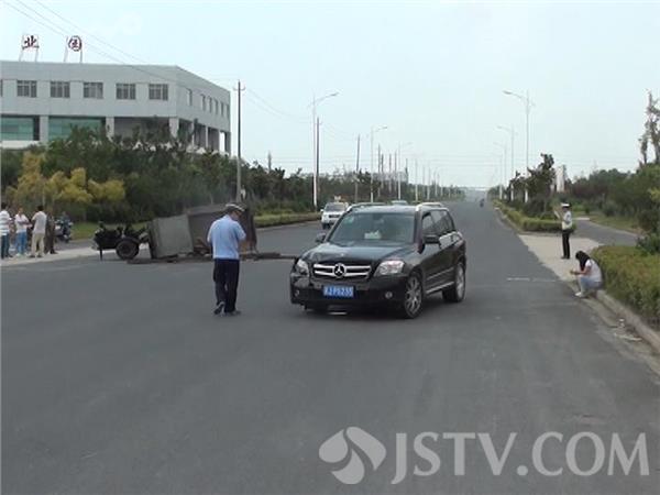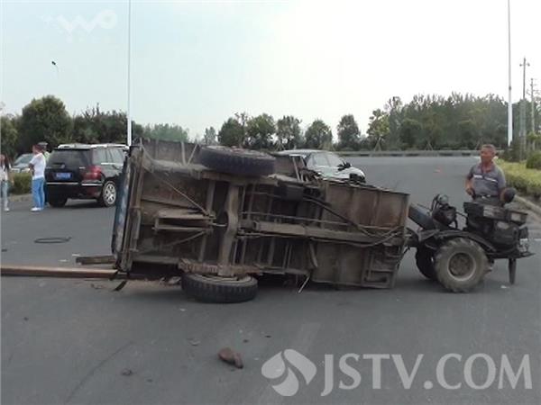 8月28日中午1点半左右,在射阳县经济开发区闽豪科技园门前十字路口,疑因避让不及,一辆由西向东行驶的拖拉机被一部北向南行驶的奔驰SUV撞翻,拖拉机被撞后尾箱旋转了180度,侧躺在马路上,所幸无人员伤亡。