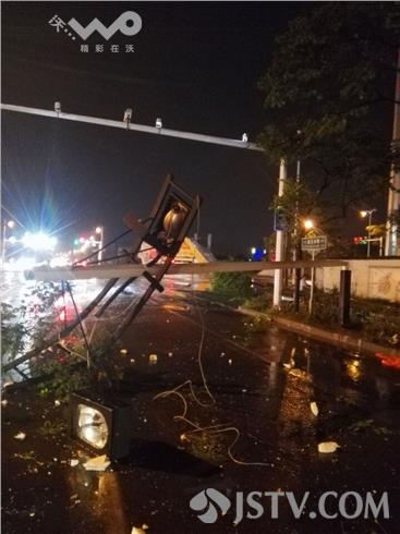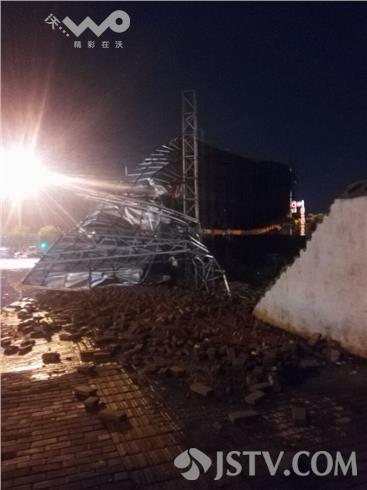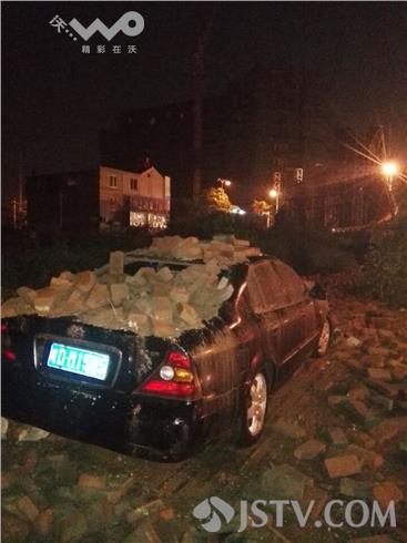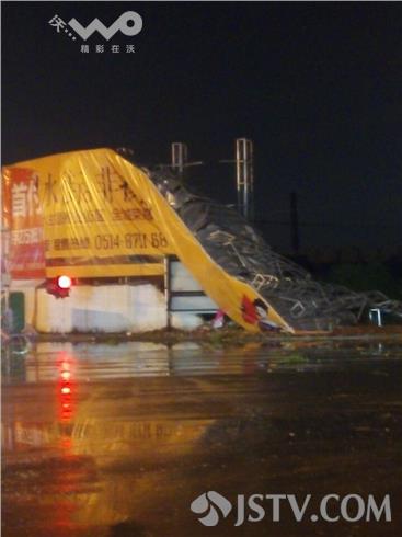 荔枝新闻记者打车采访路上看到扬州渡江路上树十颗树木连根拔起倒在路边,一根路灯杆也倒了下来横在路中间碎片里,大型广告牌也倒塌砸到路墙,附近一路墙倒塌砸中一辆安徽牌照的轿车,所幸车主并不在现场,只见车顶全是砖块,后窗玻璃也被砸坏。记者随后来到汤汪乡纪庄,一辆轿车车门部位被掉落的瓦块砸中还有痕迹,一户人家后院的房顶被几棵大树压着,一时还无法清理,随后记者在路边看到停车场路口亭被大风刮倒,横杆变行,路面也有大量积水,所幸这场大风大雨没有造成重大人员伤亡事故。