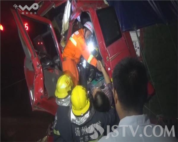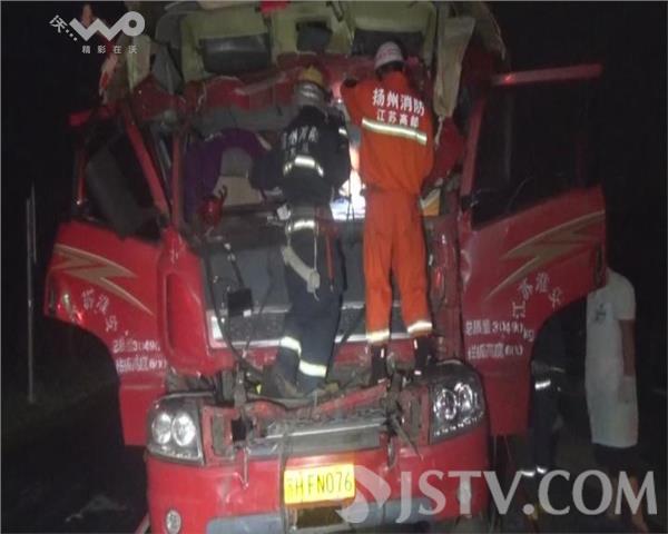 8月30日凌晨1点50分左右,新237省道扬州高邮市凌湖段,一辆半挂货车行驶至路口,一头撞上前方等红灯的货车,后车驾驶室严重挤压,司机受伤被困。当地公安、消防、120急救部门接警,迅速前往救援。