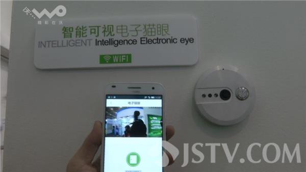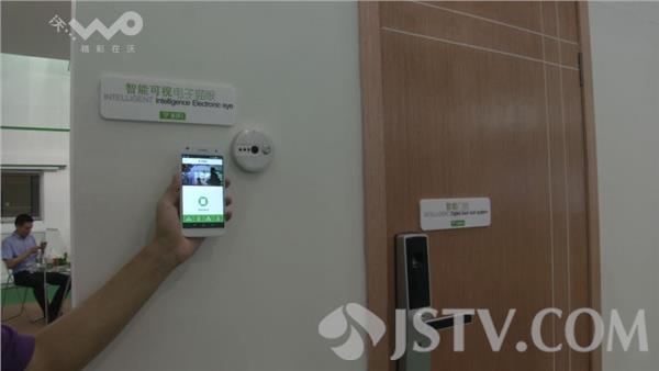 展台负责人介绍,当有人按门铃,手机会收到推送消息,可以通过这个预览门外站的是谁,也可以跟他对讲,比如家里人出门了忘带钥匙,然后在上班不可能送钥匙回来,这时候就可以用到远程把门打开。