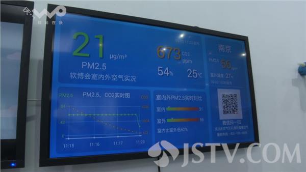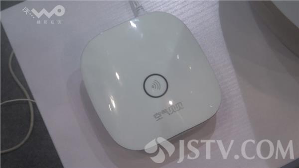 这个展台展示的就是一套智能家居系统,这是一个轻便的空气质量检测仪,放在在家中连接上网之后,就可以检测出室内这个小环境当中的空气质量,并且通过软件显示出来,包括PM2.5的浓度和二氧化碳的浓度以及和室外的空气质量的对比。