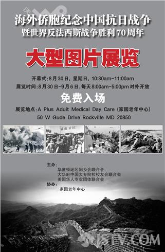 旅居美国华盛顿的南京市民王先生今天给江苏网络电视台发来消息:由华盛顿地区同乡会联合会、大华府中国大专院校校友会联合会,及美国华人专业团体联合会共同主办的纪念抗战70周年大型图片展,近日在马里兰州洛城的家园老年中心隆重开幕,大华府侨界的各界代表,大华府地区许多华人扶老携幼前来观展并参加了开幕仪式,同乡会副会长沈月亮主持纪念抗战胜利70周年大型图片展开幕式。