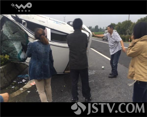 记者在事故现场看到,教练车已经完全翻车,躺在路中间的隔离带上。附近村民已经帮忙将车内人员救出,三名学员和一名教练均有不同程度的轻伤。