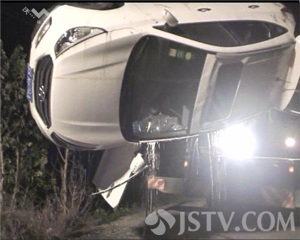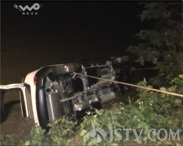 记者赶到现场时,消防员正在河里搜寻被困司机,整个车身都淹没在水里,前后灯还一直亮着。在路边草丛中,还留着车辆坠河的痕迹。经消防员核实,车内已经无人在,于是用绳索将车辆固定住,先后用消防车牵引,用手拽,再将车辆拖到岸边。