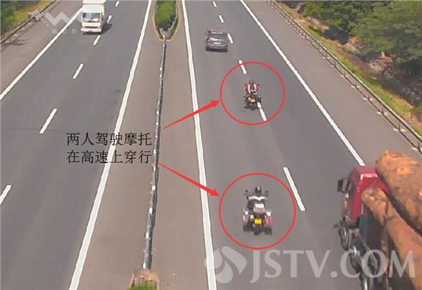 9月10日中午,徐州高速七大队民警,通过视频监控巡查时发现,两辆摩托车在京沪高速公路上飞驰,在车流中随意穿插,情况是十分危险。民警迅速通知红花埠检查站执勤民警,在收费站设卡拦截。两人被交警查获后,谎称为庆祝抗战胜利70周年,去泰州老家为参加过抗战的爷爷上坟。
