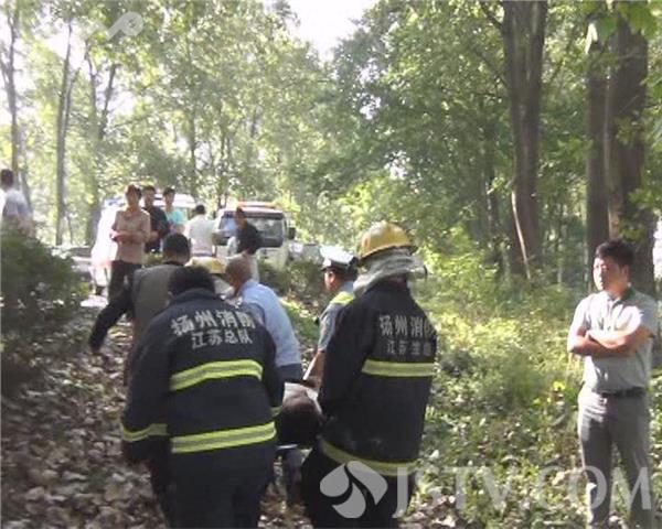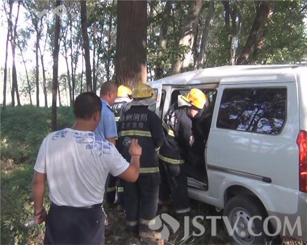 9月13日清晨6点50分左右,扬州市宝应县境内,老237省道泾河段,一辆面包车行驶途中,方向失控,一头冲下路坡,轰的一声,撞上大树,司机被卡,出不来了。医务人员给他输液,维持生命体征。消防救援人员使用撬棒和剪扩器将车门破拆开来,敲开挡风玻璃。为防止作业过程中对司机造成二次伤害,救援人员将自己的安全头盔取下,给他戴上。由于车头损毁严重,方向盘死死卡住司机腿,救援困难,救援人员将钢索系在面包车方向盘上,借助消防车牵引,往外拉。救援人员上前清理车内杂物,扩开变形的座椅,增大空间,将司机抬出。随后,该司机被救出,抬上救护车,送往医院抢救。