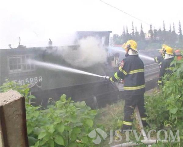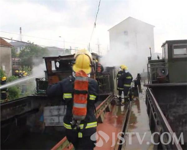 中队消防官兵到达现场后发现,一艘船船舱着火,火势处于猛烈燃烧阶段,舱门紧锁,所幸无人员被困。中队指挥立即命令一组队员利用破拆对舱门进行破拆;命令一组队员从外侧出2支水枪对火势进行强攻,等待舱门破拆完毕后进入舱内扑救大火。经过全体消防官兵40分钟的扑救,大火被完全扑灭。经询问船主得知,起火原因为电线短路引发。