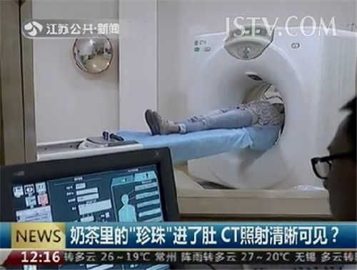 一杯珍珠奶茶下肚后,记者按平时消化普通食物所需的时间,等了半个多小时后,进入CT室。CT一照,立刻发现异常!不大的胃里,居然密密麻麻地排着二十多个清晰可见的白色圆点!