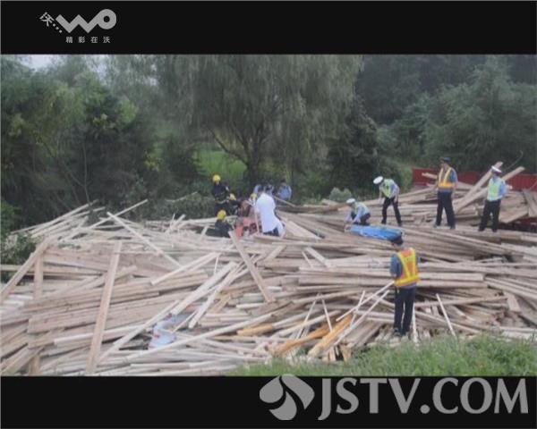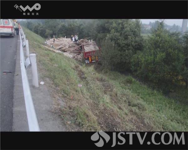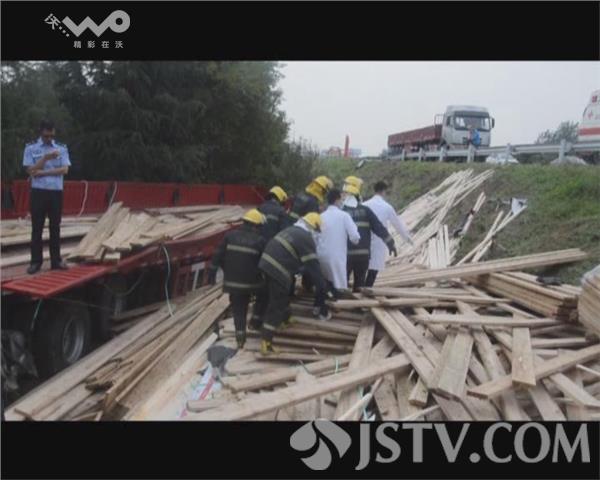 事故现场,消防、交警等救援人员正清理木板并搜寻被困人员。一辆红色的大挂车车头严重变形,车上装载的木板倾泻的满地都是。从现场痕迹看,挂车撞断高速护栏后沿着下坡高速行驶10多米之后撞上了坡下的树根,导致车头严重变形,3人被困。