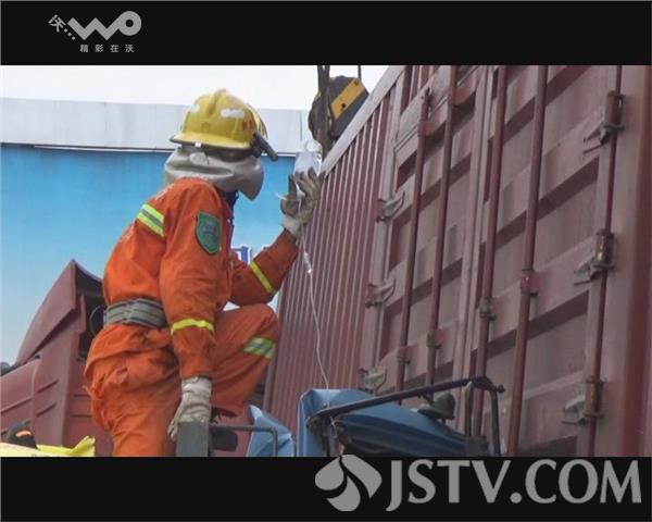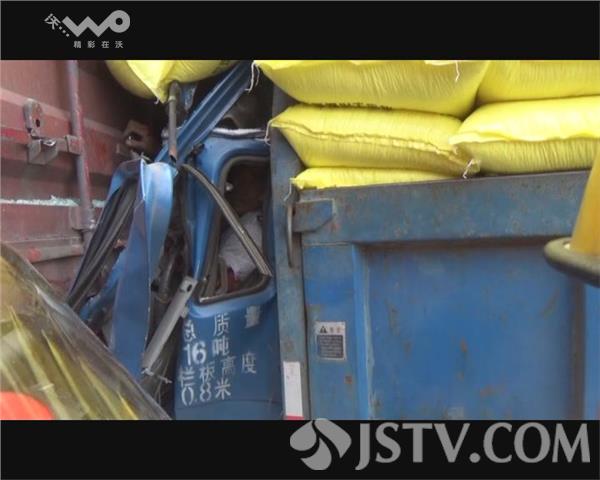 记者赶到现场时看到,事故处理民警已将事故路段封闭,消防官兵正在现场救援,一辆大型货车停在马路上,车身已经倾斜。而一辆满载尿素的小型货车,车头严重变形,四名驾乘人员被困在驾驶室内无法动弹。其中一人伤情较重,医护人员已帮他挂上了吊瓶,一名消防官兵站在车顶手举吊瓶,不停的与车内人员说话,让他们保持清醒。大货车司机介绍了当时车祸发生的情况。