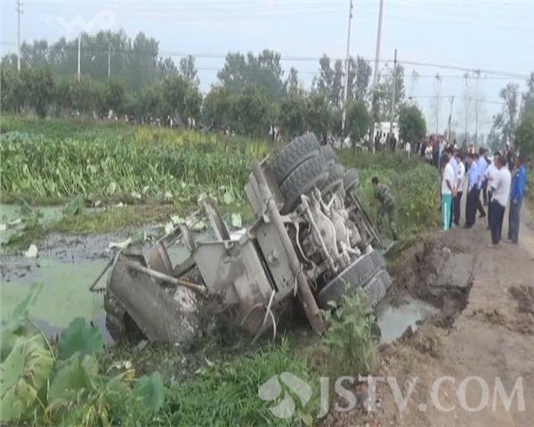 9月25日7时30分,淮安市淮安区车桥镇丰年村段一辆混凝土搅拌车在倒车时,不慎侧翻在路边河塘内。