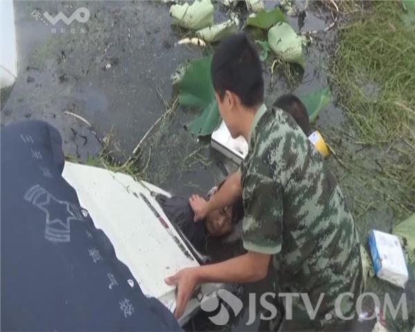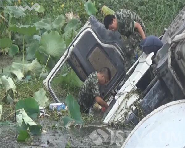 当消防队员赶到事故现场时发现,河边上站满了围观群众,一辆混凝土搅拌车侧翻在河塘内,车身一半淹没在水中,驾驶室进水司机被困。消防队员下水查看被困司机情况,庆幸的是司机虽然整个身体浸湿在水中,但头部还在水面上可以自主呼吸。通过与被困司机交流得知,司机身体没有被任何物件卡住,只是驾驶室已变形,无法逃生。消防队员先用小铁锤将驾驶室后侧的窗户敲碎,再将窗户处的杂物清理干净后,被困司机在消防队员的帮助下成功逃生,并由急救车送往医院进行身体检查。