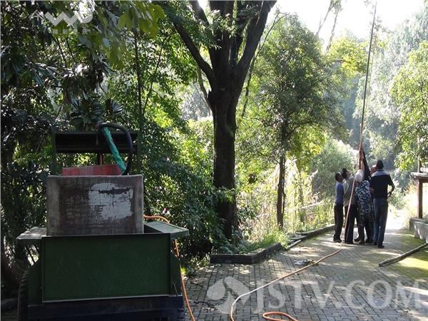 在现场看到,绿化工人开始禁止游客靠近大树,7位工人正用敌敌畏和敌杀士药水向榆树喷药水,大马蜂不停飞舞,有的掉落,也有马蜂飞下来惊吓园工,大约2小时终于喷除蜂窝。