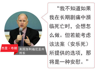 美国加利福尼亚州州长杰里·布朗5日签署了一项允许医生协助晚期患者服药结束生命的法案。根据新法,需要有两名医生在判定患者存活期不超过6个月的情况下,应患者的书面要求,同意为其开出致命药物,协助其自杀。患者必须有能力自行吞下药物,必须在智力上有能力作出这一医疗决定。——新华网