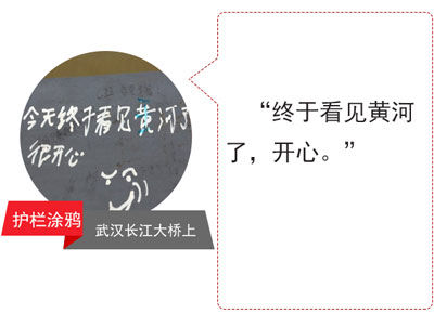 国庆期间,武汉长江大桥上人流如织,出现一些不文明的现象,如大桥护栏的另类涂鸦,成了一道怪异的风景,吸引不少人观看。武汉长江大桥桥头堡中间的主桥南护栏上有140多处文字涂鸦,北侧护栏上有150多处。大多都是用白色涂改液写的,很难擦掉。——大河网