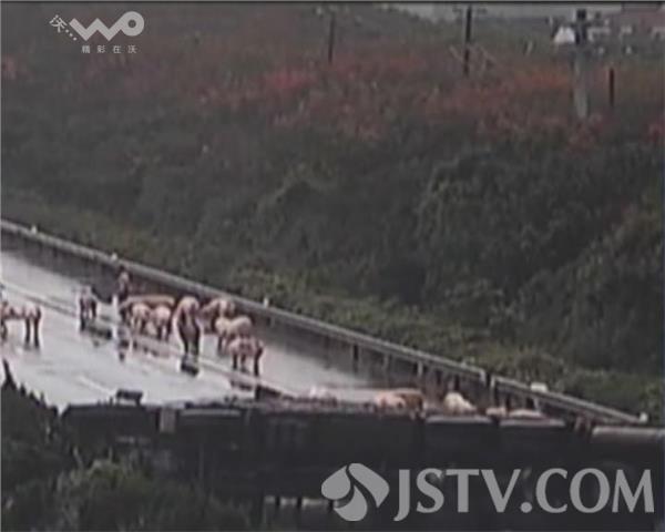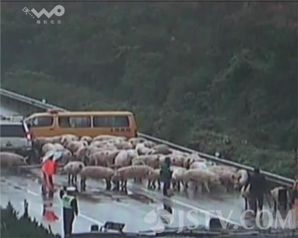 昨天(10月8日)上午,常台高速苏州吴江黎里318国道出口附近,一辆载有几十头生猪的大货车侧翻,几十头生猪在高速上乱跑乱窜。