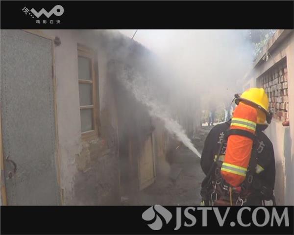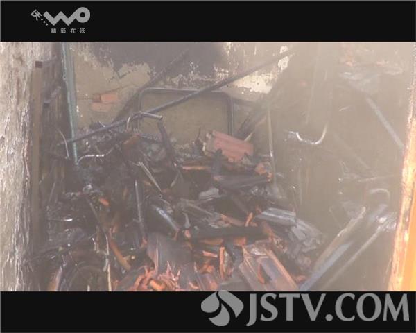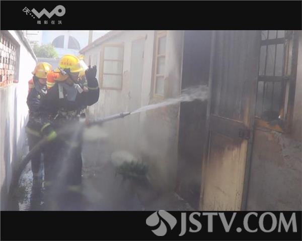 在火灾事故现场,只见浓烟弥漫了整个车库的上空,两排相连的砖木结构的民房中,浓烟不时从车库冒出,由于车库门采用防盗措施,赶来的消防队员只好选择从窗户进行灭火,利用水枪进行冷却后,火势才逐渐减弱,车库内堆放的大量杂物,也导致车库内不时有浓烟产生。在强行打开车库门后,水枪手从正面对火势进行了控制,车库门因为是木质结构,已经被大火烘烤变黑,为防止火势向两侧民房蔓延,一名消防战士爬上房顶进行隔离处置。最终,经过30分钟的处置,大火被完全扑灭,但车库内的三辆电瓶车则烧毁一空,只剩下铁架子。