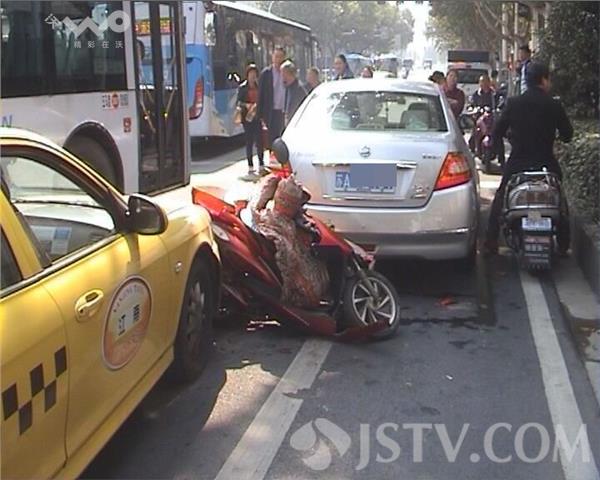 今天(10月13日)中午11:40分左右,南京鼓楼区热河南路150号门前快车道上,一辆银灰色轿车在等红灯时,突遭后方一辆电动车猛烈追尾,追尾发出的巨大声响将车上女司机吓了一跳。女司机随后下车查看,此时骑车男子已倒地不能动弹,原来他竟是被后方一辆出租车突然撞击后撞向了自己!女司机随后报警。