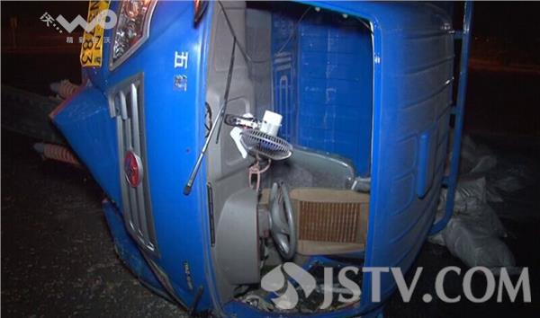 赶到现场看到被撞的华普轿车刚被事故拖车拖离现场,受伤的农用三轮司机被120送往附近医院救治。现场农用三轮车侧翻在地,车上数吨铝粉散落在地,现场两名工人正在将散落的铝粉运到货车上,农用车损毁严重,整个挡风玻璃碎裂,油箱和发动机受损,整个车体不同程度变形。