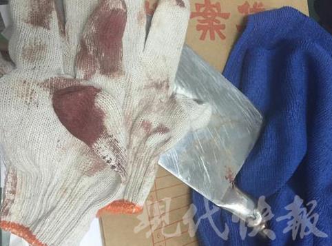 协管凌某被菜刀砍伤后,用手捂着头部,手套和刀上还有血迹。现代快报记者王益摄