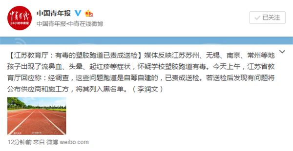 据中国青年报·中青在线微博@中国青年报10:55许发布消息称,【江苏教育厅:有毒的塑胶跑道已责成送检】,具体内容如下: