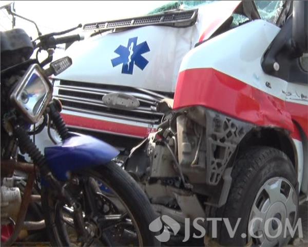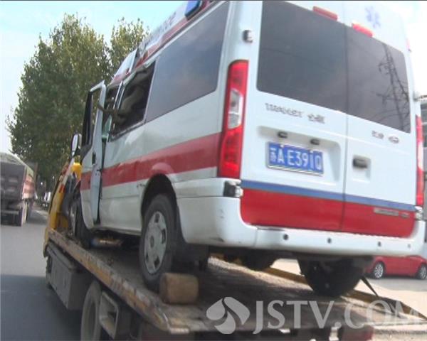 10.14下午市民爆料,在浦口永宁宁除快速通道路口,一辆南京牌照的120救护车和摩托车相撞,多人受伤,一人死亡,接到爆料后立即赶往现场。离现场不远处救护车已经被拉走,车子前面已经完全破碎,车头严重受损,在永宁路口看到一道长长的刹车痕迹,有30米左右,地上有一滩血迹,玻璃碎片和被撞坏的一些东西到处都是,一根交通信号灯杆已经被撞变形,信号灯已经坏了,死者孙子小陈说,应该是摩托车闯红灯横穿马路,120速度有点快,避让不及撞到一起,然后又撞到信号灯杆,导致车子侧翻路边,120车上除了驾驶员以外其他人都受了伤,随后3辆120到场将伤者分别送到附近医院抢救,其中一人死亡,7人受伤。
