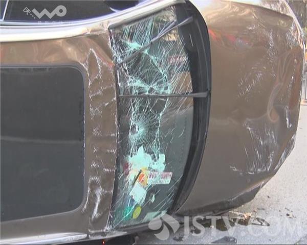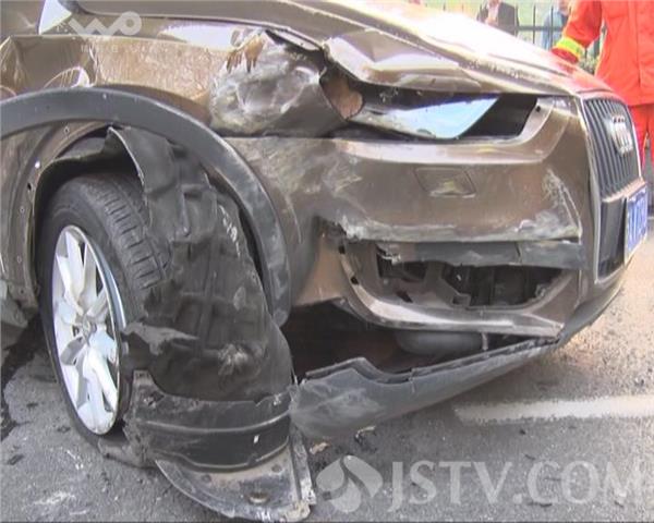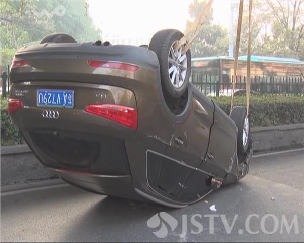10月16日早晨6点多,一辆奥迪Q3轿车由北向南行驶到大桥南路时,一头撞上了路中央的水泥墩,车辆四脚朝天,造成路堵,不少在公交车上的乘客只好下车步行去上班。