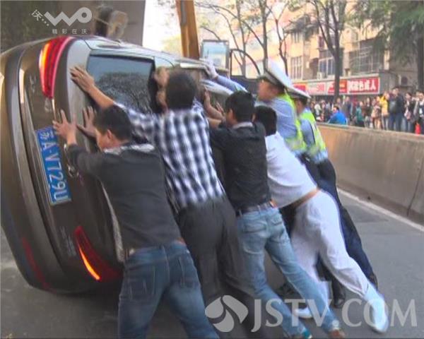 为了解决早高峰的路堵,交警六大队民警调来吊车,在路人的帮助下把轿车扶正拖离现场,堵了40分钟的道路交通恢复了正常。