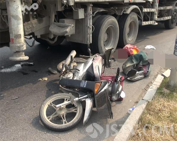 10月16日中午11点30左右,有一对夫妻俩开着摩托车准备回老家奔丧,经过盐城市大丰区疏港路与大刘路交叉口时一辆水泥输送车由北向南准备拐弯向西时,把他们夫妻俩刮倒,摩托车上二人当场倒地,座在摩托车后面的一名女子不幸卷入车轮之下,当场被压死,摩托车驾驶员逃过一劫只是衣服被刮破,驾驶员随后报警,很快110、120到达现场勘查,被压死的女子被120送往殡仪馆等待处理。