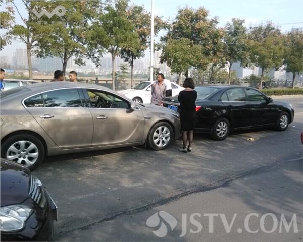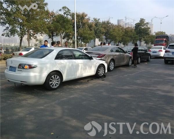 当时大桥上车流比较多,第一辆白色别克轿车看到前方车子停车了,由于车速较快急踩了刹车,后面的科鲁兹轿车反应不及就撞了上来,而第三辆别克轿车发现前方追尾撞车也跟着踩刹车,虽然车是停下了,但后方第四辆马自达轿车没有及时刹住撞了上来,四辆车这才连环撞在了一起。