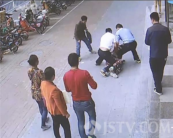 王警官在确认男子为网上逃犯后,便不动声色的走到了办理业务的等待区,一边稳住男子,一边试图用电话向同事请求增援。此时,男子似乎察觉到了民警的想法。为了防止男子逃跑,民警立即上前将男子往大厅的角落逼近,就在此时,男子趁其不备,绕过大厅中央的长椅,拔腿就往门外跑。