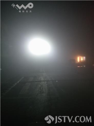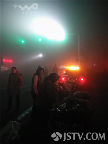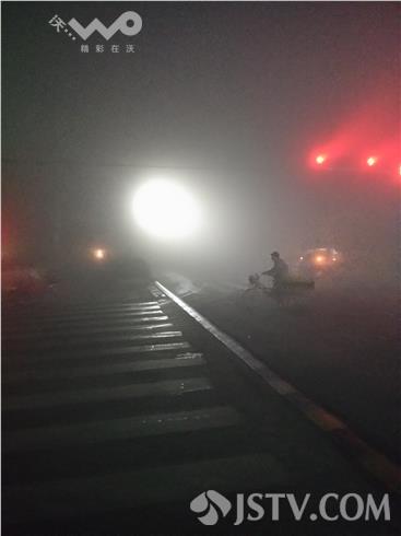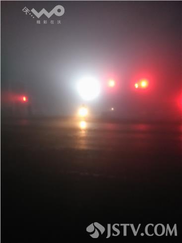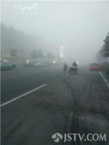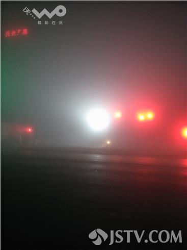 在兴化332省道安丰五院路口看到,浓雾中红绿灯也已显得模糊,一些出租车停在省道边候客很是不安全,许多车辆虽然打开了灯光,但是在浓雾中还是步履蹒跚,因为今天能见度只有10米,还是在建议大家最好等雾散后再出行。