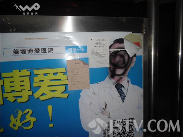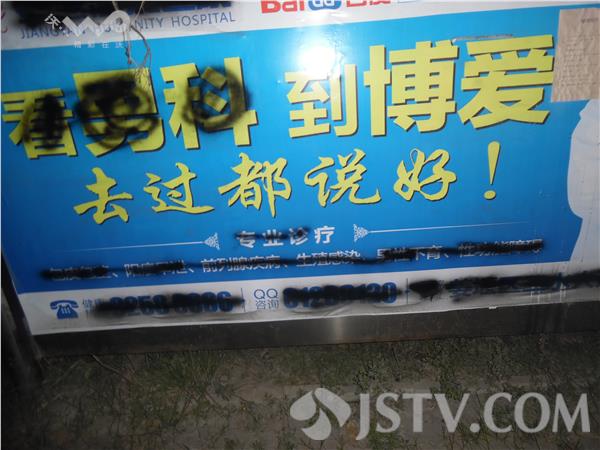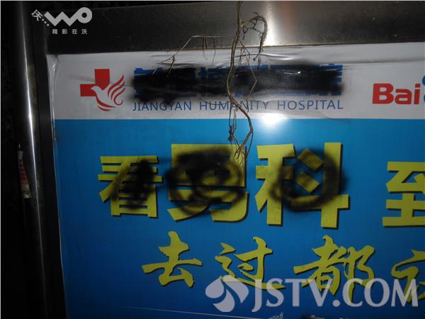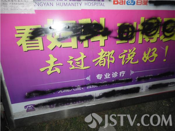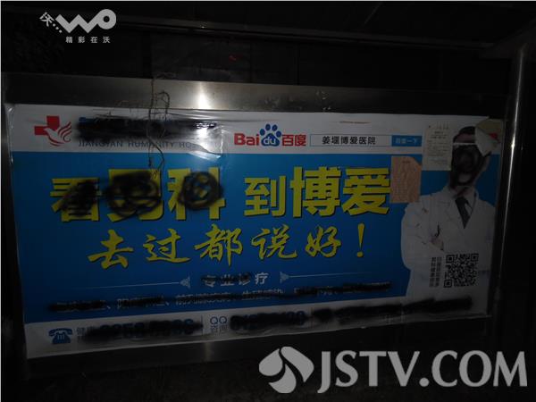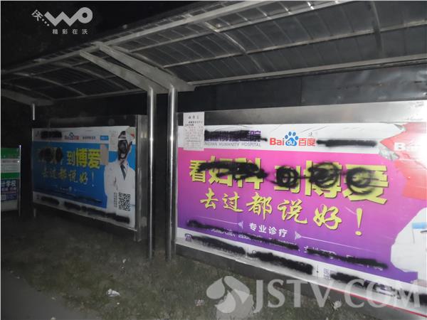 10月25日晚上在姜堰市兴泰镇入口的一公交站台上看到一妇科医院的广告遭到严重涂损。广告上面的人物被涂了个大花脸,电话号码、医院的地址都被涂得一塌糊涂,估计是同行所为。