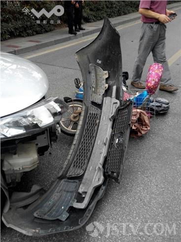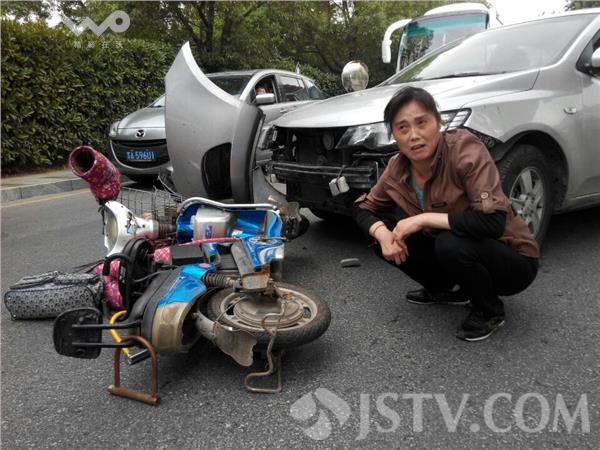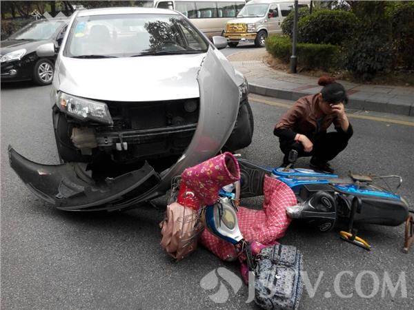 10月26日下午15:10左右,南京江宁湖滨金陵饭店附近门口,发生一起交通事故,一轿车转弯时,撞上一骑电动车女子,幸好只是腿受伤,没有什么大事。现场发现,电动车压在保险杠下,女子坐在地上。据骑车女子讲:当时她由北向南骑至江宁区佳湖东路8号湖滨金陵饭店出口处,突然,一辆轿车从饭店出来,左转进入佳湖东路时,由于观察不细,加上转弯半径占用左侧车道,与直行电动车发生撞击,女子翻上发动机盖,然后又滑下掉在地上,造成女子只是腿上受伤。女子说,好在我身体好,要是撞到老人麻烦就大了。车头保险杠脱落。事故原因正在处理之中。