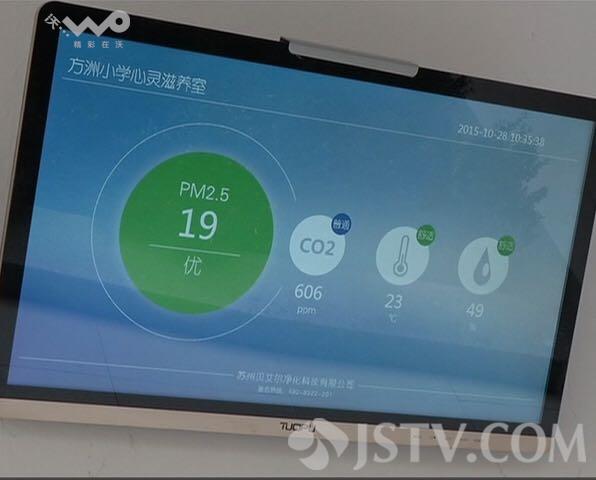 新风净化器、全热交换器以及智能控制器,再加上这个显示屏,就组成了江苏省内首个无霾教室,在教室外的显示屏上,室内PM2.5的数值、二氧化碳的数值以及温度、湿度都一目了然。