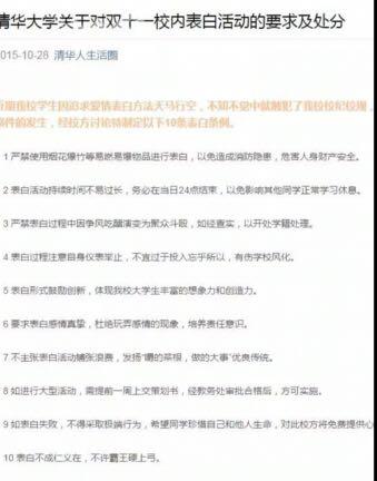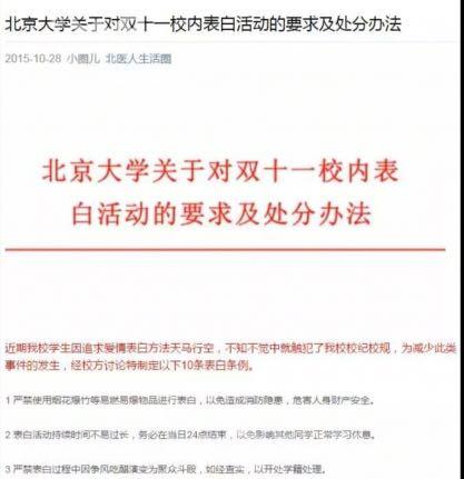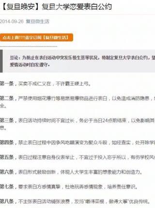 据了解,条例最早是由南京大学学生恶搞创造的,但并非校方官方发布。2011年即被疯传,每年的情人节和光棍节前后,便是它重出江湖的日子。 一位学生表示,这里面最后一条是'霸王硬上弓',这个行为太可恶了。比如别人不愿意,你还要死缠烂打追着别人,这样对别人也会造成影响。 另外一位学生表示,如果有了这种条例,一方面是潜移默化的规范了表白行为,另外也是提高学校的知名度啊。 这一表白条例也受到了其它高校的效仿和传播。第一个'借鉴'的是南开大学官方微博,正文一字未改,仅标题里把南大改成了南开,在官微愉快地发布了出来。接下来,全国各校的同学纷纷抄袭,一抄就抄了三四年。但抄着抄着,议论声也传来了。 一位学生表示他觉得挺合适的,就是限制你不要做一些出格的事情,对大家是有一定好处的。而另一位同学表示觉得没必要,大家都是成年人,靠自己,有什么事情自己解决啊,学校规定了,也未必能执行。 甭管赞同于否,不可否认的是近年来,表白日、光棍节都已被渐渐带入了学生的校园,并随着成年单身男女群体的庞大,以及群体活动和网络媒体的传播在社会流行开来,但一些过激的行为,着实让人心生厌烦.