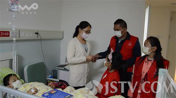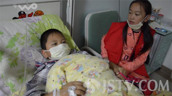 荔枝新闻记者10月31日下午,随爱心人士的车队一起到苏州儿童医院,到了医院时天已经要黑了,而史华听说从老家有爱心人士要来医院看望小利伟早早的就站在医院门口等待,当史华看到有一群穿着红马夹上面印有大丰爱心联盟的志愿者时,激动得两眼泪水直流,记者随史华一起进病房,看到小利伟躺在床上,身体很虚弱,看到我们到来,小利伟有话要对我们说,但是已经说不出来。
