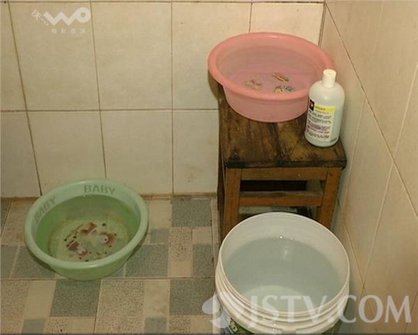 一位老大爷介绍,自己高血压 又心脏病,真是没得办法,厕所没得水冲,洗衣服洗澡都谈不上了,没得电没得煤气都不要紧,就是不能没有水。记者进入到一户居民的家中,厨房、卫生间都摆放着接水的盆。这户居民刚搬进来不久,女主人马上要临产,真是把他们愁坏了。