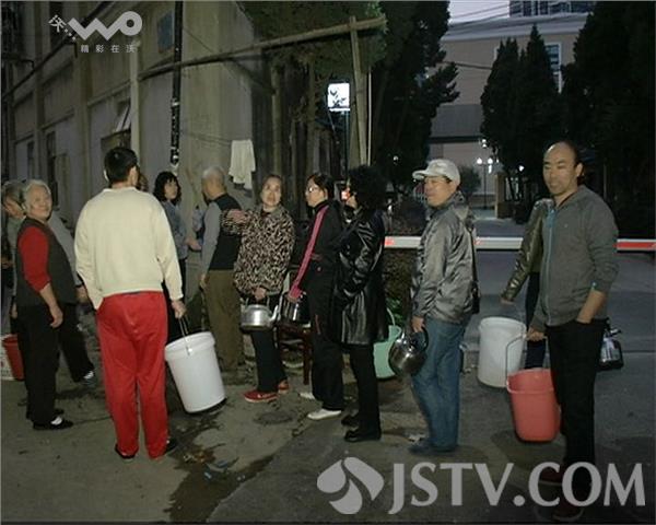 昨天晚上六点多钟记者在飞龙大厦小区看到,居民们只能拿着桶 ,到楼下小卖部排队,拎水上楼。这就难坏了一些老人。
