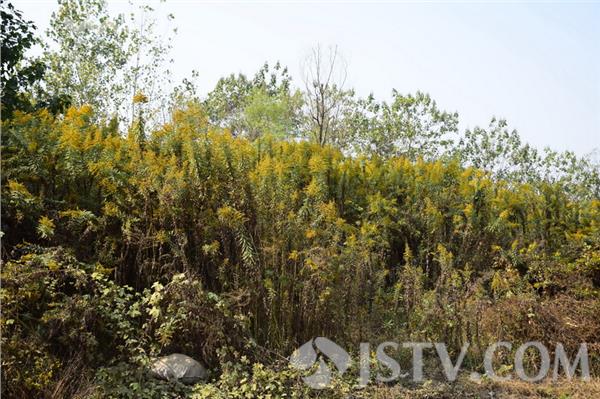 根据指点,笔者找到了该处长有大片一枝黄花的景区边缘地带。现场看到,一枝黄花长势确实很好,很多都已高过了人头,黄花蔓延所到之处,其他低矮植物几乎已被消灭殆尽。初步估计,一枝黄花占地约有数亩,因紧邻景区边缘,大片黄灿灿的花儿老远都能看见。
