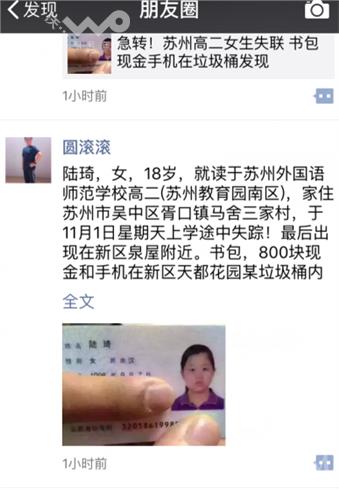 昨天(11月3日)晚上,苏州微信朋友圈里大量转发一条苏州一名高二女生在去学校的离奇失踪,到目前为止这名女生音讯全无。。
