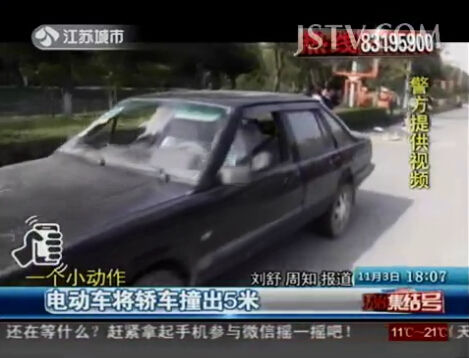 10月19日上午9点多,镇江扬中市大全路上发生一起电动车追尾轿车的事故。与一般事故不同的是,电动车居然将轿车撞出了5米远,一辆电动车怎么会有这么大的冲击力呢?