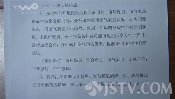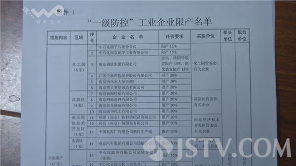 南京市环保局的工作人员介绍,一级管控方案有十二条,主要方面包括,第一有四十三家工业企业要实行限产百分之十五或者选择阶段性停产。第二是工地加严防尘管控措施,对不落实防尘管控措施或者超标排放的工地实施停工整治。第三就是保洁,对于主干道每天要进行一次的清洗两次的撒水。二级管控措施就是有更多的工业企业按照限产百分之三十或者间断性停产百分之三十来管控。对于工地涉及到土方和物料运输的要全面停工。保洁实行更严厉的措施。